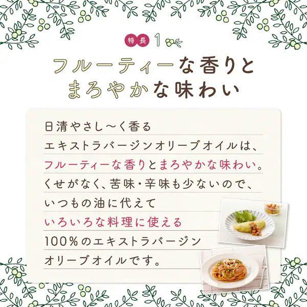 フルーティな香りとまろやかな味わい。くせがなく、苦味・辛味も少ないので、いつもの油に代えていろいろな料理に使える100%のエキストラバージンオリーブオイルです。健康維持に大切で、酸化に強いオレイン酸が約70%。