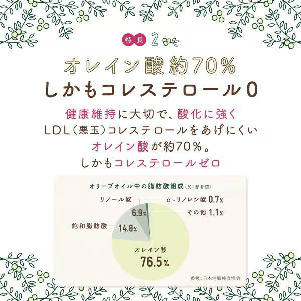 フルーティな香りとまろやかな味わい。くせがなく、苦味・辛味も少ないので、いつもの油に代えていろいろな料理に使える100%のエキストラバージンオリーブオイルです。健康維持に大切で、酸化に強いオレイン酸が約70%。