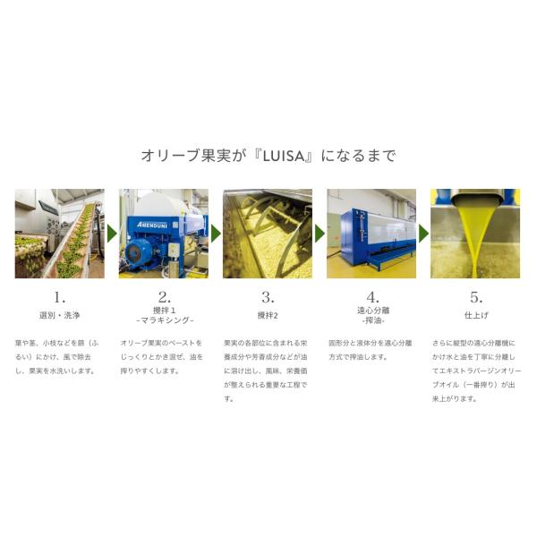 ルイーザさんの「オリーブオイルは人を幸せにする」という信念のもと、自家農園の有機オリーブ果実のみを使用して作られた「ルイーザ(LUISA)有機エキストラオリーブオイル」。