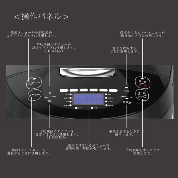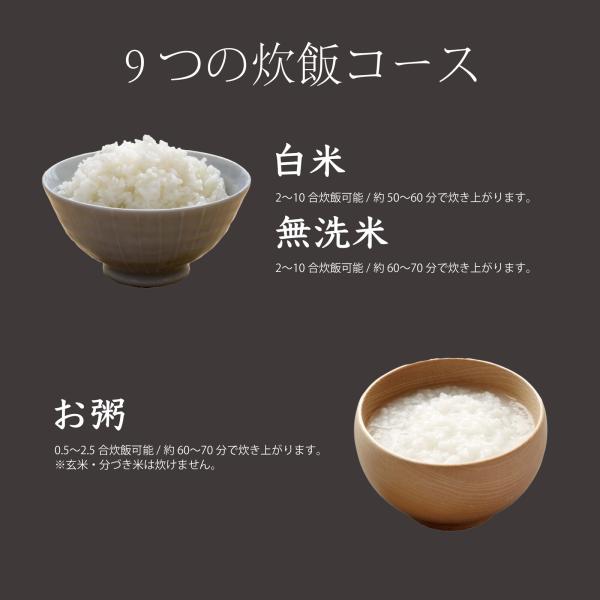 メニュー:白米、早炊き、無洗米、玄米、スチーム、お粥、炊込み、雑穀米、再加熱