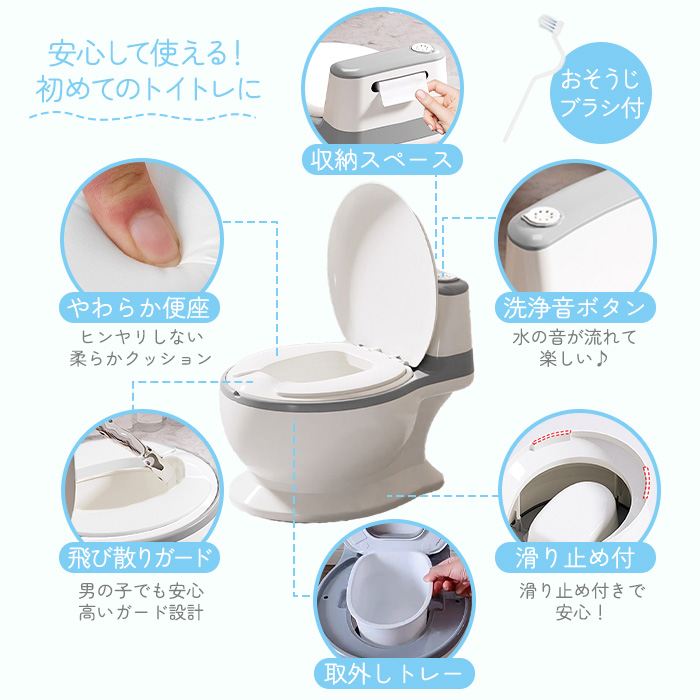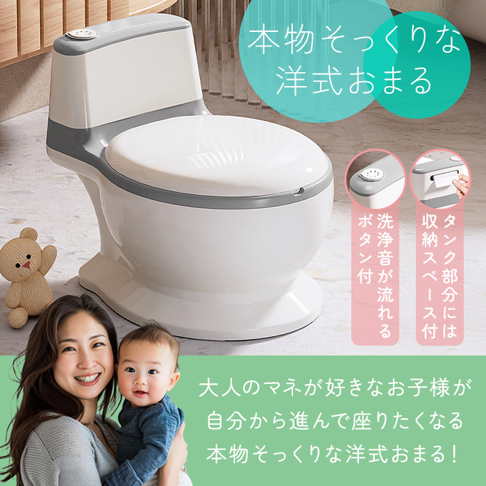 まるで本物そっくりな洋式方のおまる。大人のまねが好きなお子様が進んで座る洋式のおまるです。ボタンを押すと水の流れる音がするので流すまでの習慣が身につきます。ひんやりしない柔らかい便座に、取り外し簡単なトレーで使いやすい。タンク部分には収納スペース付。初めてのトイレトレーニングにおすすめです!
