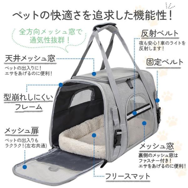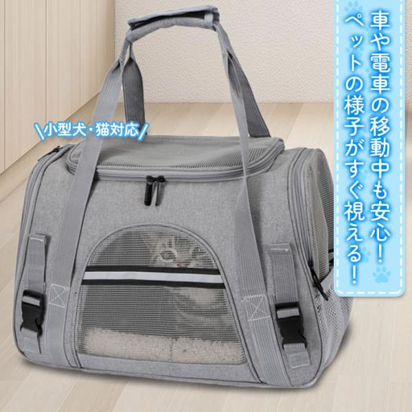 大切なペットとお出かけ!通気性抜群のペットキャリーバッグです。メッシュ窓でペットの様子をいつでも確認できる安心設計!肩掛け、手提げ、キャリーオンの3WAY仕様で使い方いろいろ♪
