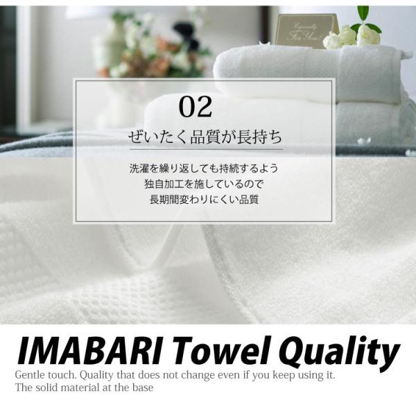 高級cottonの糸を贅沢に使用しており、タオル生地本来の素早い吸水性と柔らかい肌触りが長時間持続する特殊加工を 施すことで、洗濯を繰り返しても柔らかさが長時間持続し贅沢な感触が長持ちします。