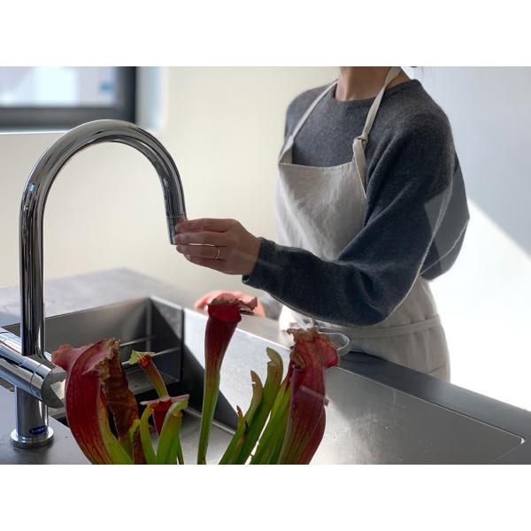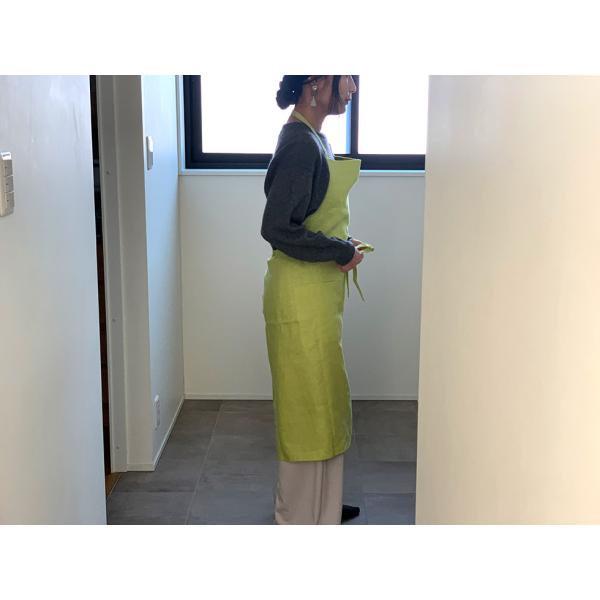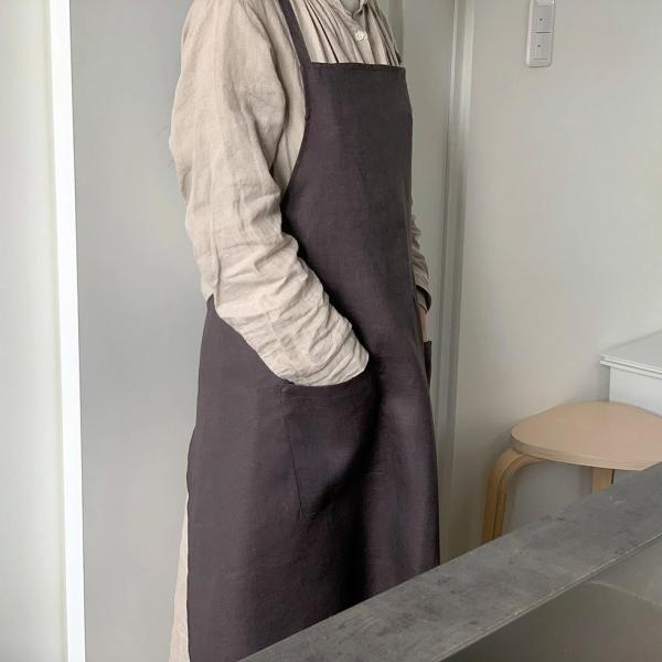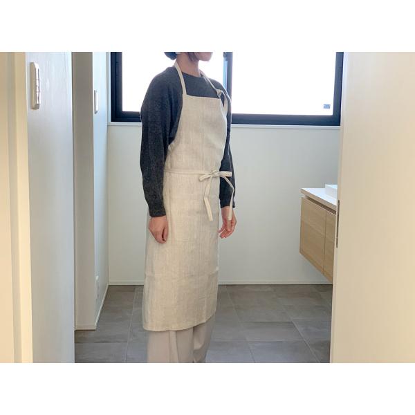 素材のリネンはさらっとしたさわり心地の透け感の無いしっかり目の生地を使用。リネンは吸水性抜群で汚れにくく、丈夫で長持ちな為、日々の暮らしで使用するエプロンにはぴったりな素材です。