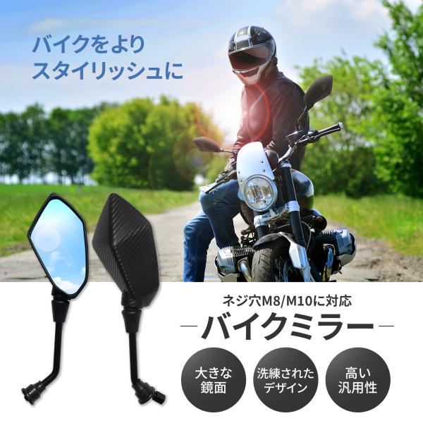 バイク ミラー 8mm 10mm 多角形 カーボン 調 ブラック 左右 セット (選べる2サイズ) 汎用 サイドミラー オートバイ バックミラー カスタム 正ネジ 黒