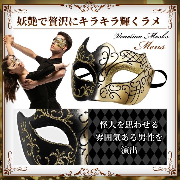 仮面 ベネチアンマスク:贅沢に施されたキラキラ輝くラメが妖艶な、男性向けのデザインと女性向けデザインのマスカレードマスクのセット。舞踏会やダンス パーティーなどであなたを華やかに彩ります。