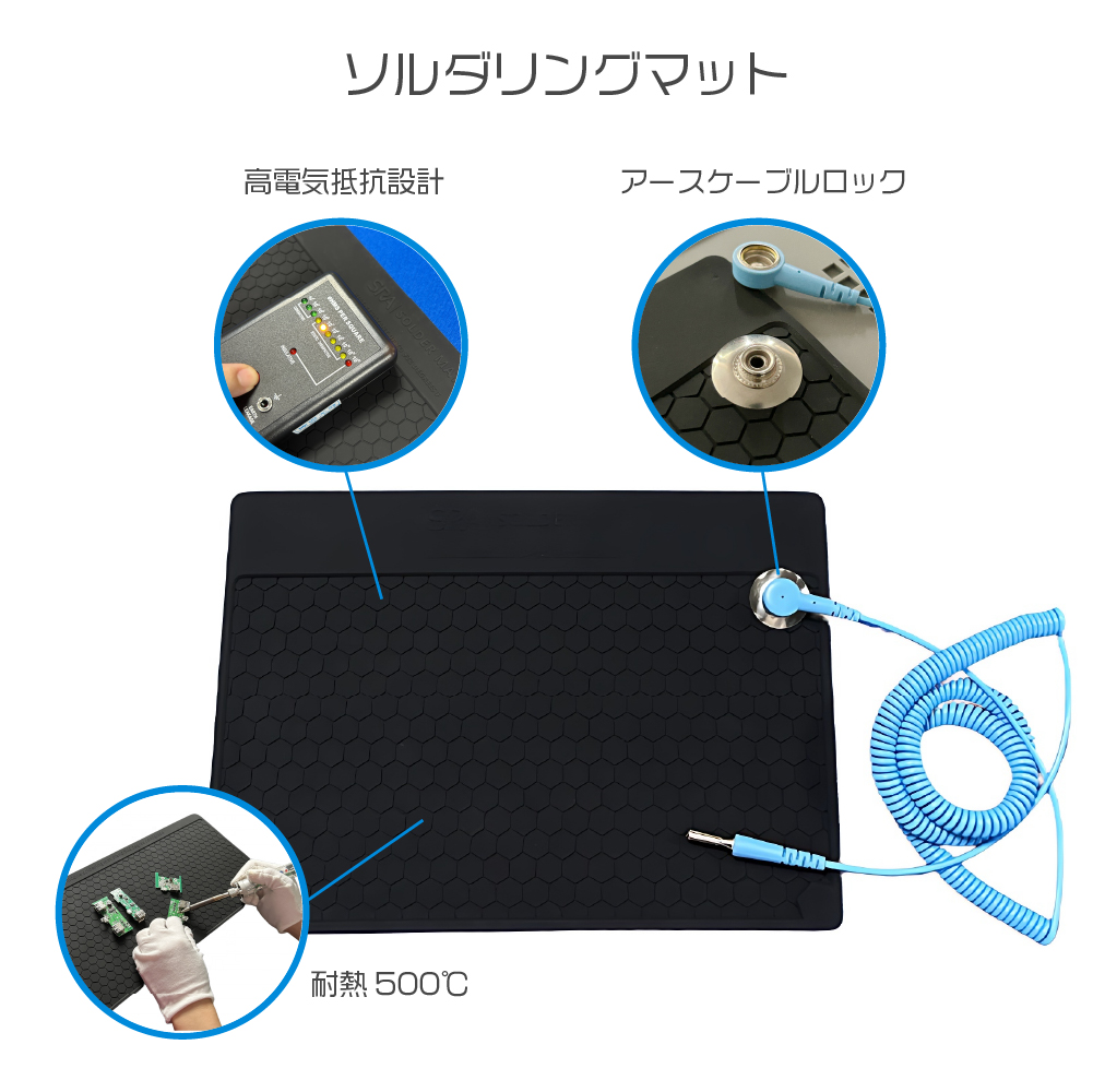 ソルダリングマットにも静電気対策が施されアースケーブルをマットから作業机の金属部などに取り付けることで、