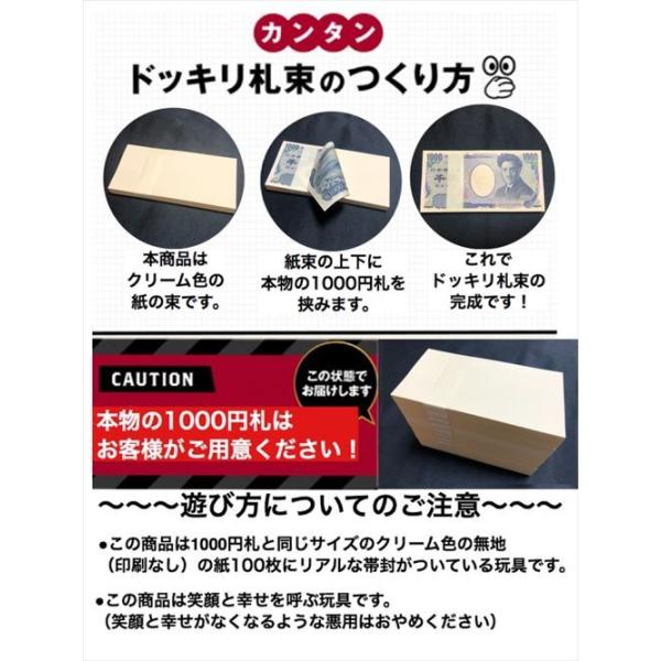 ●1000円札と同じサイズでクリーム色の無地の用紙です。1束は100枚です。 ※写真は、見本のため上下に本物の1000円札を挟んでいます。ご使用時には、ご自分で本物の1000円札を入れてください。 ●帯は銀行で使用している本物です。●子供たちにお年玉や誕生日プレゼントドッキリとしてぴったりの商品です★ ※くれぐれも悪用なさらないようにお願い致します。 ★使用例 ・ドッキリとして家の机に置いておく ・子どもや孫にお年玉、お小遣いとして渡してみてびっくりした顔を見る ・SNS(インスタ、フェイスブック、ツイッター等)でお友達に自慢してみたりする ・ギャンブル(パチンコ、スロット、競馬等)をする前にお祈りしてみる ・宝くじと一緒に置いたりお財布に入れて金運アップ ・お金を数える練習 (画像、説明文の引用、転載は禁じます。)