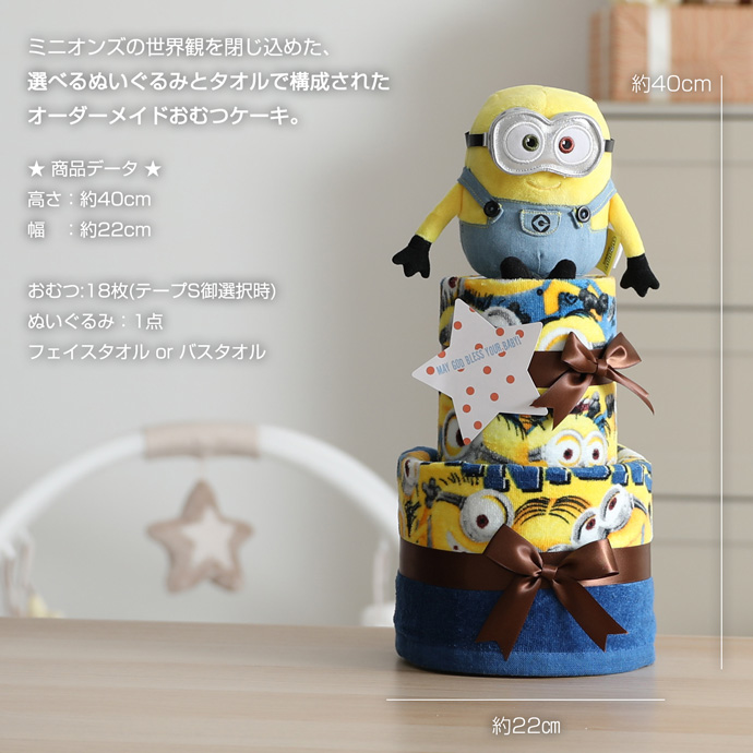 おむつケーキ 2段 ミニオンズ minions 出産祝い 名入れ 男の子 女の子 乳幼児 おもちゃ バスタオル オムツケーキ ギフト キャラクター 赤ちゃん ボブ ティム
