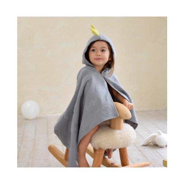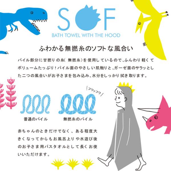 恐竜をモチーフにしたデザインが男の子はもちろん、女の子にも喜ばれそうなSOFのフード付きバスタオルです。