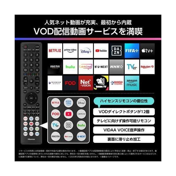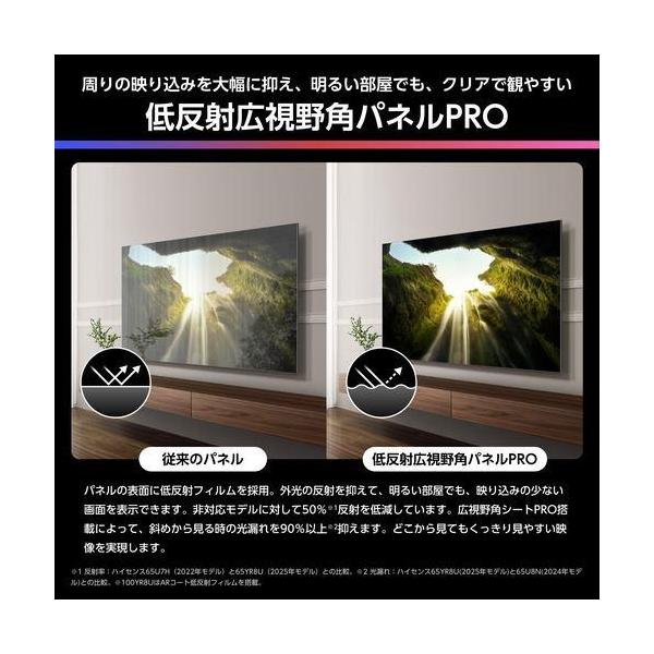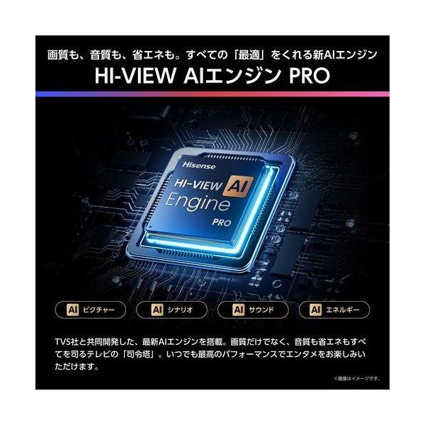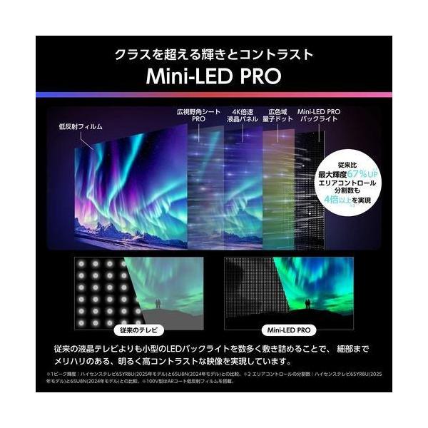■最先端のAIエンジンがもたらす、MiniLEDハイグレードの新基準■周りの映り込みを大幅に抑え、明るい部屋でも、クリアで見やすい■Mini-LED PROバックライトとAIエンジンによるエリア制御で、高輝度・高コントラストな映像を実現■さらに、低反射広視野角パネルPROの採用により、斜めからでも色鮮やか■AIが音を最適化、天井から音が降ってくるような立体音場を実現■2.1.2ch構成の最大出力70W音響システム■TVS社と共同開発した最新AIエンジンが、画質・音質・省エネを統合的に制御■速い・簡単・楽しい。VIDAAでスマート体験■メーカー3年保証