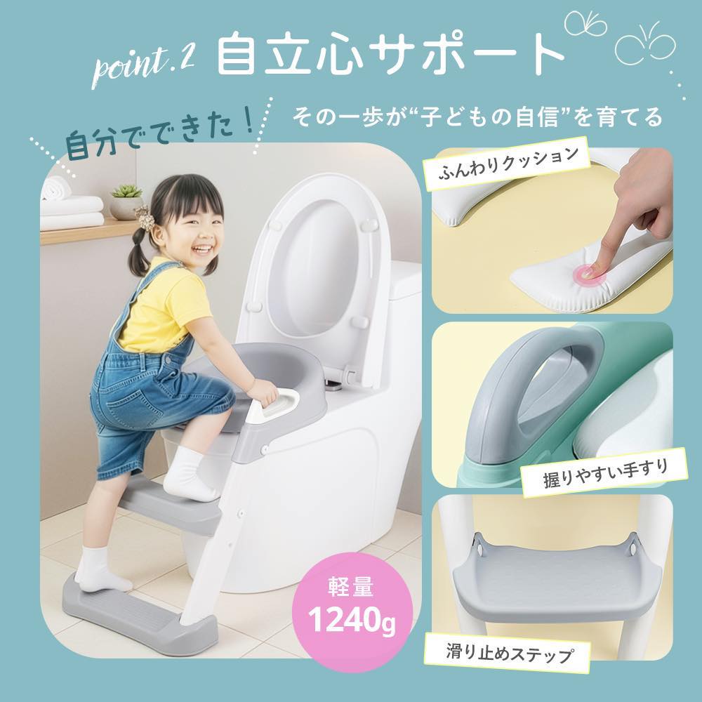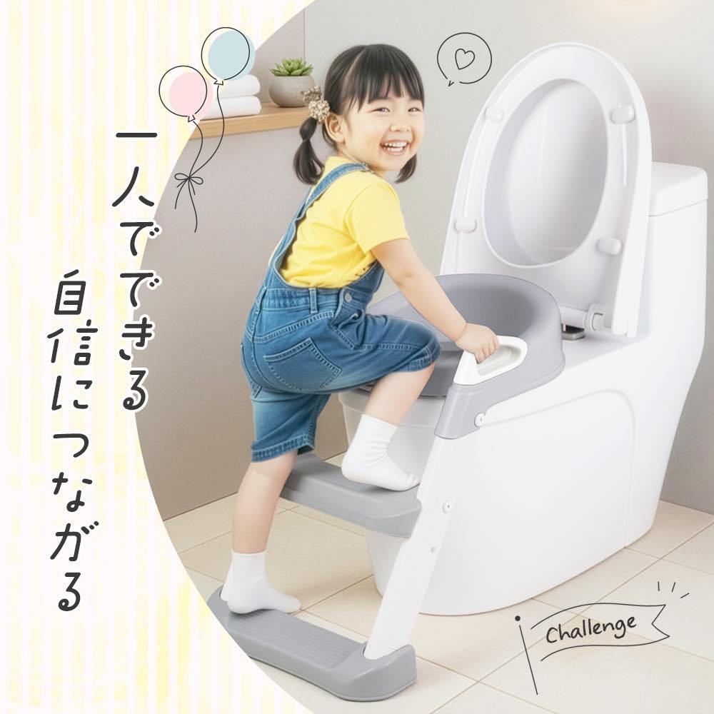 お子さまの「ひとりでできた!」を叶える補助便座。ステップ付きで安心して登れる安全設計。折りたたみ可能で収納もラクラク。柔らかいクッション付きで快適な座り心地。