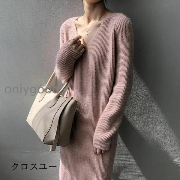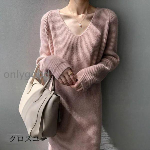 ニットワンピース レディース 秋冬 ロングワンピース ニット ワンピース ロング ワンピー Vネック 無地 シンプル ミモレ丈 ワンピース 長袖 カジュ
