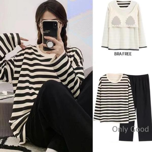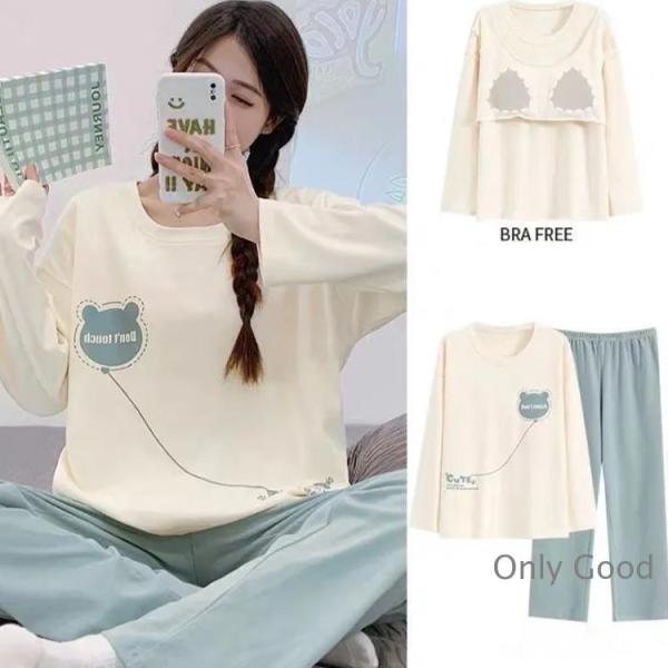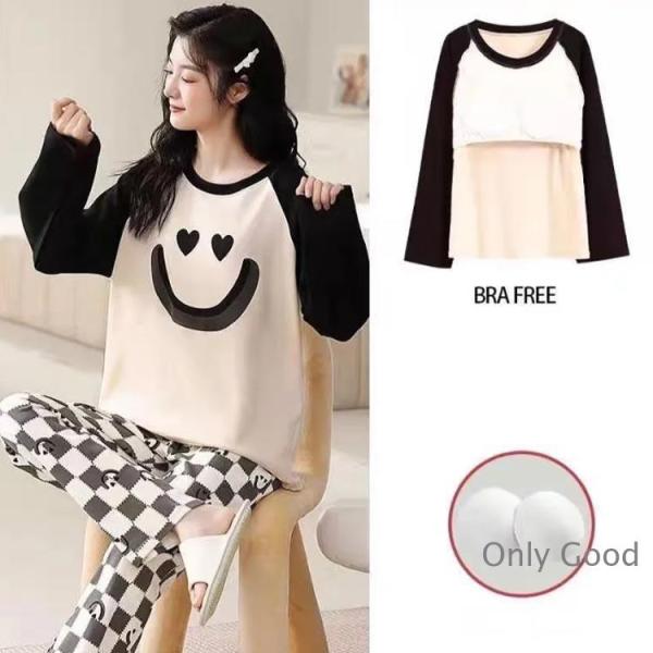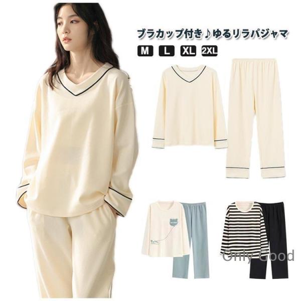 カップ付き ルームウェア レディース パジャマ 上下セット セットアップ 長袖 Tシャツ 秋 冬 カップ付き ナイトウェア ロングパンツ ウエストゴム