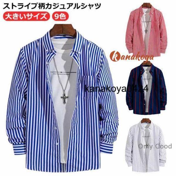 トップス 5l ブルー 大きいサイズ おしゃれ メンズ カジュアルシャツ 長袖シャツ メンズ お兄系 ストライプシャツ 春夏 緑 春秋 秋 春 お洒落