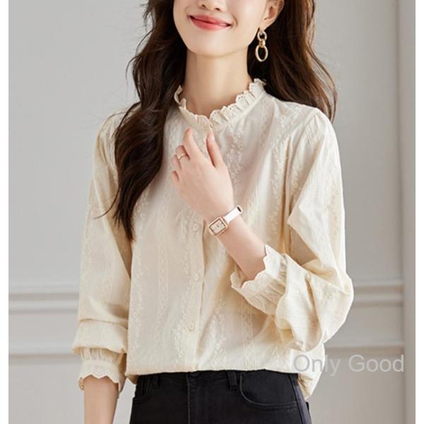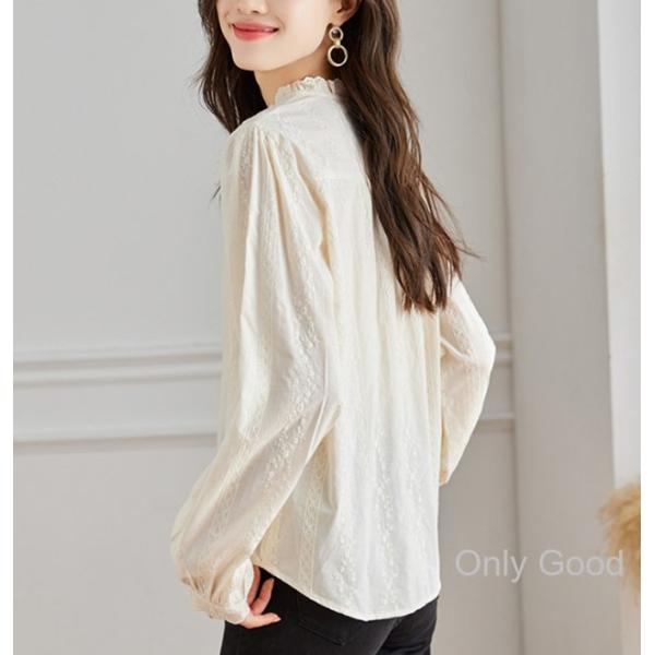 ブラウス 立ち襟 フリル レディース 長袖 シャツ 無地 白 襟フリ