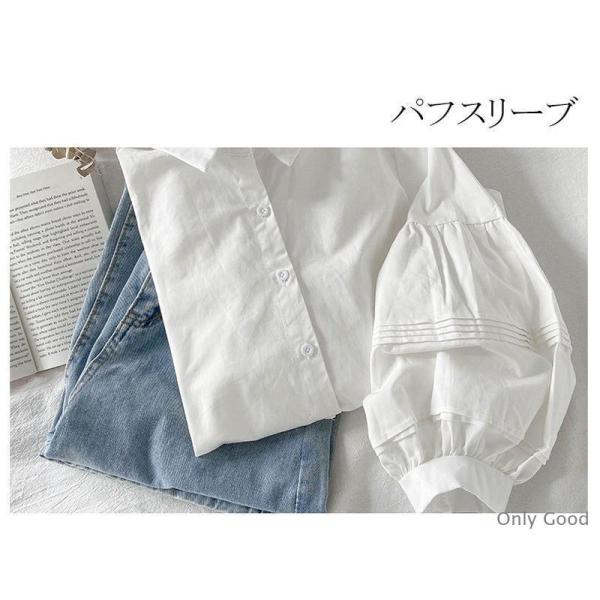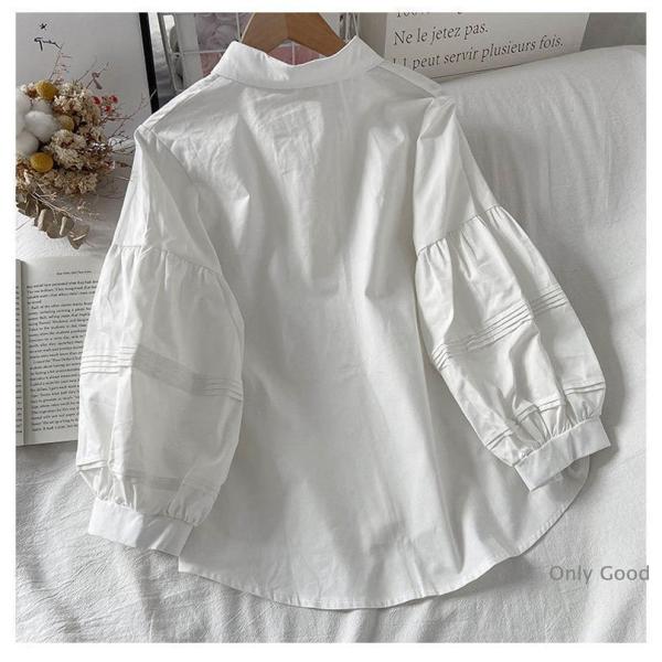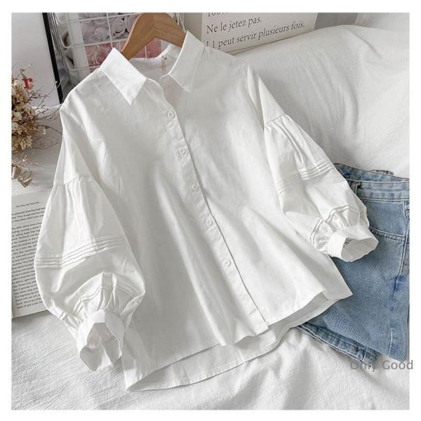 キーワード:白シャツ シャツブラウス 七分袖 春物 春夏 レディース トップス 前開き ボリューム袖 パフスリーブ 綿 コットン 体型カバー ゆったり 折襟 ラウン 無地 ボタン留め ホワイト 大きいサイズ 白 デザイン 可愛い きれいめ おしゃれ コーデ 20代 30代