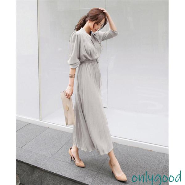 ワンピース プリーツ レディース ベルト 春秋服 きれいめ シフォン 長袖 シャツ 秋物 Aライン ロング丈 ハイウエスト 二次会 通勤 OL 着痩せ