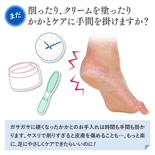 ガサガサのかかとが約3日間でツルツルに!保湿クリームも不要、削ることもなく、履くだけでかかとがしっとりします。その理由は、かかと部分に特殊シート。そのシートが足から自然に出る水分を保持し、固くなったかかとを保湿して、やわらかくツルツルにします。