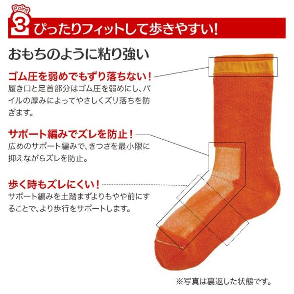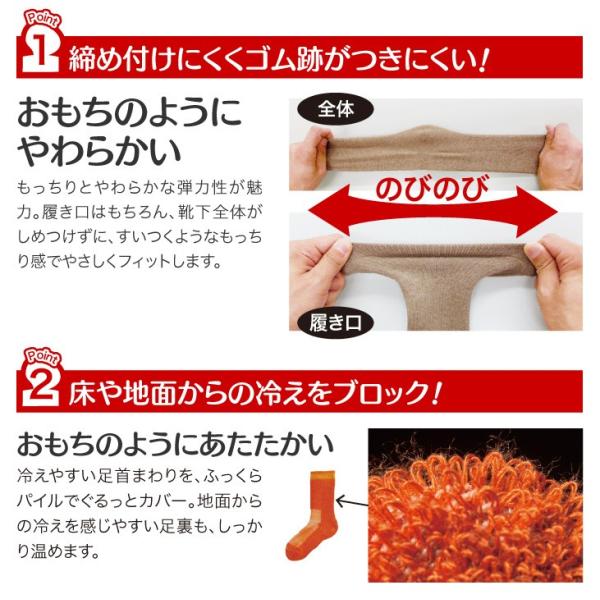 ほくほくあったか!もっちりやわらか!粘り強くてズレにくい! もっちりと柔らかな弾力性が魅力。履き口はもちろん、靴下全体が締め付けずに、吸いつくようなもっちり感でやさしくフィットします。冷えやすい足首の周りをふっくらパイルでぐるっとカバー。 地面からの冷えを感じやすい足裏も、しっかり温めます。履き口と足首部分はゴム圧を弱めにし、パイルの厚みによって 優しくズリ落ちを防ぎます。 足の甲部分は、広めのサポート編みで、きつさを最小限に抑えながらズレを防止。
