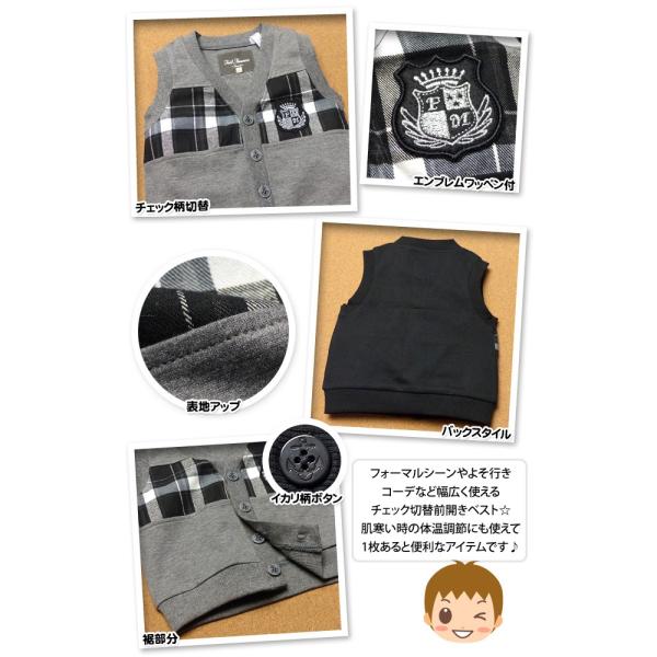 送料無料 ベビー服 男の子 ベスト フォーマル 前開き チェック切替 エンブレム ワッペン装飾 イカリボタン 男児 ベビー 80cm 90cm 95cm メール便対応