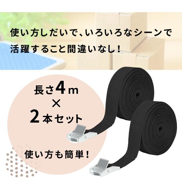 荷締めベルト/4m/黒/2本/セット/バックル/固定ベルト/引っ越し/シンプル/固定バンド/緩まない/車/自動車/バイク/ツーリング/荷物/固定/荷物固定/安全/荷締め/ベルト/バックル/金具/簡単/多用途/運搬/結束バンド/荷締バンド/荷締機/調節可能/荷崩れ防止/使用簡単/転倒防止/家具/棚/バックル式/強力ベルト/金属製/キャンプ/ソロキャンプ/荷物の固定/キャンプグッズ/アウトドアグッズ/収納/バーベキュー/BBQ/優良配送/送料無料/