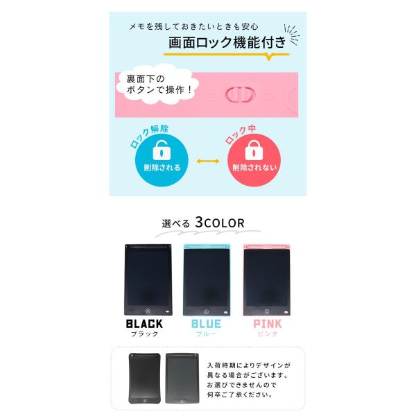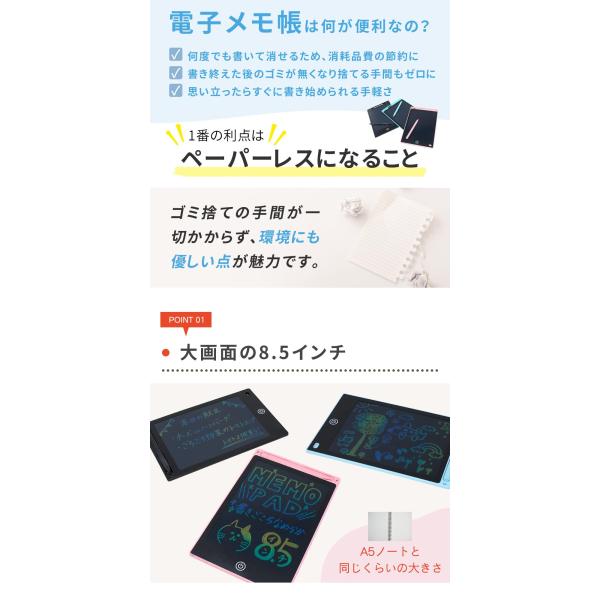 電子/電子メモ/電子メモパッド/8.5/8.5インチ/ワンタッチ/簡単/手軽/繰り返し/繰り返し可能/再利用/電子ノート/スマートノート/電子メモタブレット/タブレット/デジタルノート/ノート/デジタル/軽量/薄型/メモ帳/メモ/メモパッド/文房具/文具/筆記用具/おえかき/メニューボード/看板/8.5インチ電子メモ/削除ボタン/ロック機能/機能/タッチペン付き/手書き/メッツセージ/メッセージボード/献立/献立ボード/子供/キッズ/おもちゃ/ペーパーレス/二刀流/優良配送/送料無料