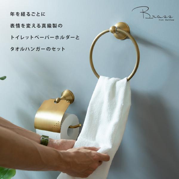 年を経るごとに表情を変える真鍮製のトイレットペーパーホルダーとタオルハンガーのセットです。