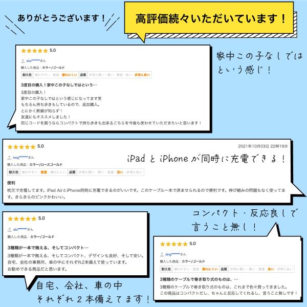 商品名:充電ケーブル 3in1 急速 巻き取り iPhone type-c リール pd Android 充電 ライトニングケーブル タイプC Lightning microUSB かわいい おしゃれ 1m