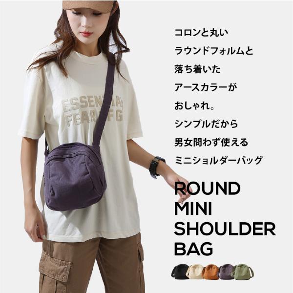 コロンと丸いラウンドフォルムと落ち着いたアースカラーがお洒落。シンプルだから男女問わず使えるミニバック。