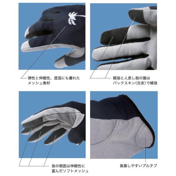 掌側=親指と人指し指はバックスキン(合皮)、指の側面は伸縮性に富んだソフトメッシュ