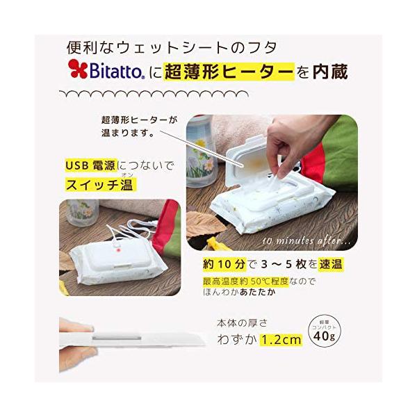 市販のおしりふき・手、口、体拭きなど、各種ウェットシートがぽかぽか!「Bitatto温」がロック付になって登場!便利なウェットシートのフタ「ビタット」に、超薄型ヒーターを内蔵。モバイルバッテリーなどをつなげば外出先でもウェットシートがぽかぽか!寒い時期のおでかけをサポートします。■材質:本体-ポリプロピレン、ABS、アルミニウム(台湾製)/粘着部-ウレタン系エラストマー(日本製)■本体仕様:電源・DC5V/1.0A■消費電力:2.2W■最大温度:約50℃■USB電源ケーブルの長さ:80cm■本体サイズ:W120×D80×H12 /重量40g