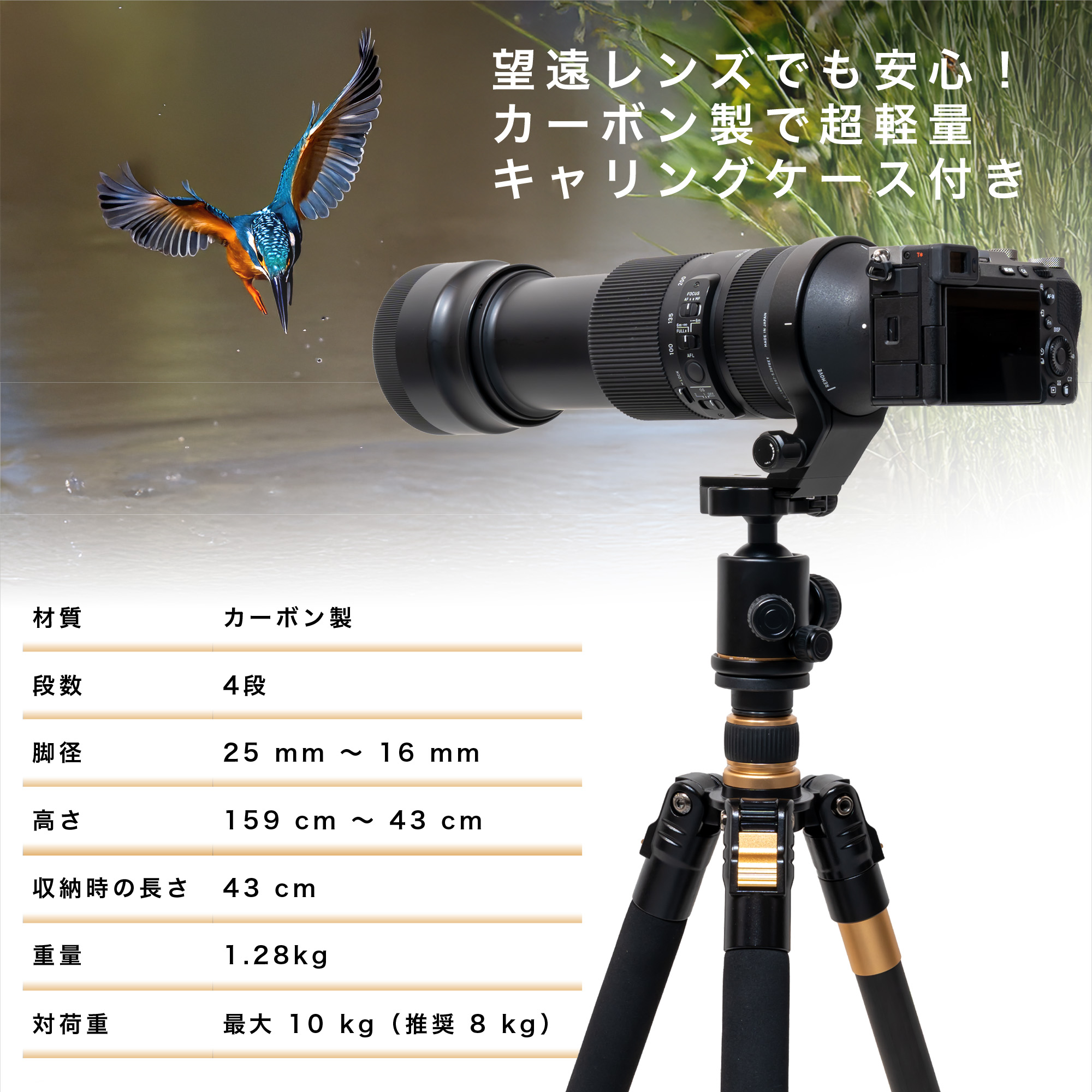 重さ1.66kg、収納時43cmのコンパクトボディで、最大耐荷重10kgを実現し、中望遠レンズを装着した一眼レフにも対応します。
