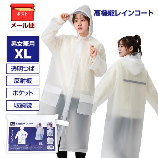 メール便 高機能レインコート XLサイズ 1枚 透明 男女兼用 透明つば付き フードひも付き ポケットあり 反射板 レインウェア 使い捨て 業務用