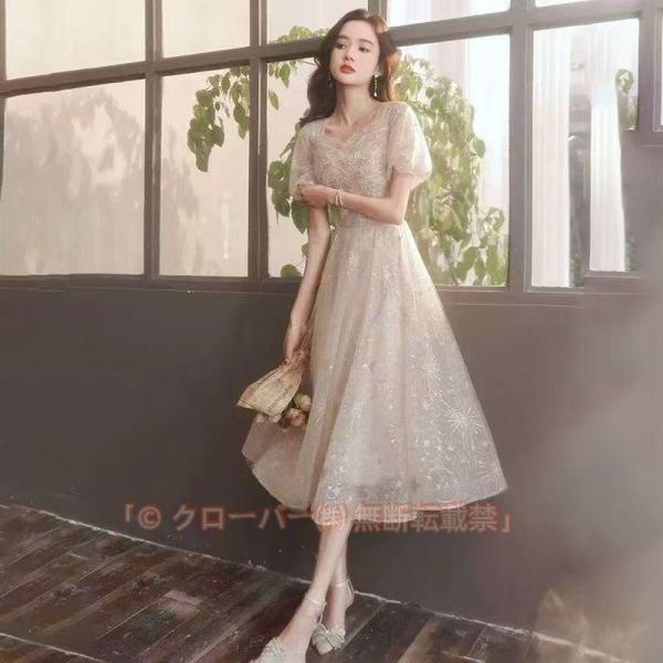 イブニングドレス ベージュ パフスリーブ パーティードレス ロングドレス 星柄 オシャレ キレイめ 発表会ドレス 演奏会ドレス Aライン ピークル ロング丈
