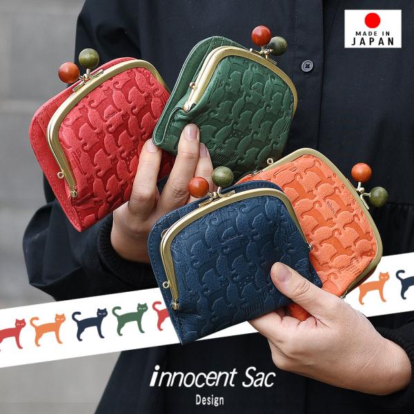 がま口 二つ折り財布 レディース 猫 日本製 本革 がまぐち 丸木玉 姫路レザー 型押し CAT ネコ ねこ 猫財布 使いやすい innocent Sac イノセントサック