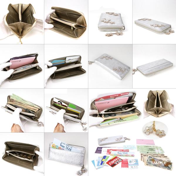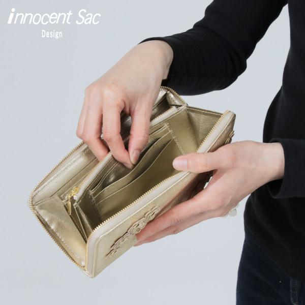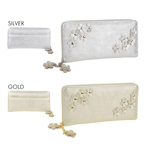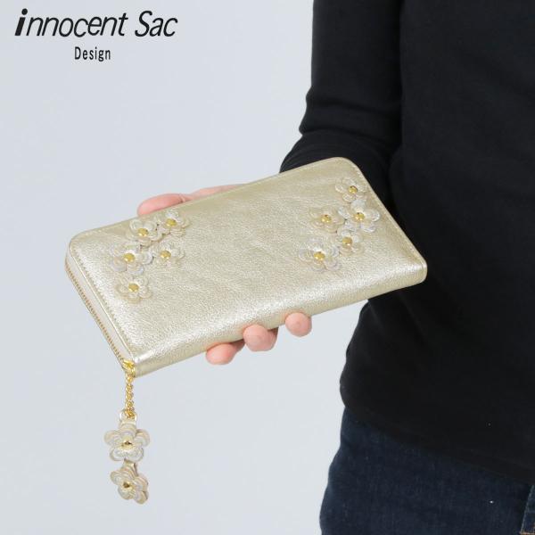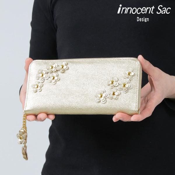 長財布 レディース シルバー ゴールド ラウンドファスナー 本革 日本製 花飾り アップリケ イノセントサック 牛革