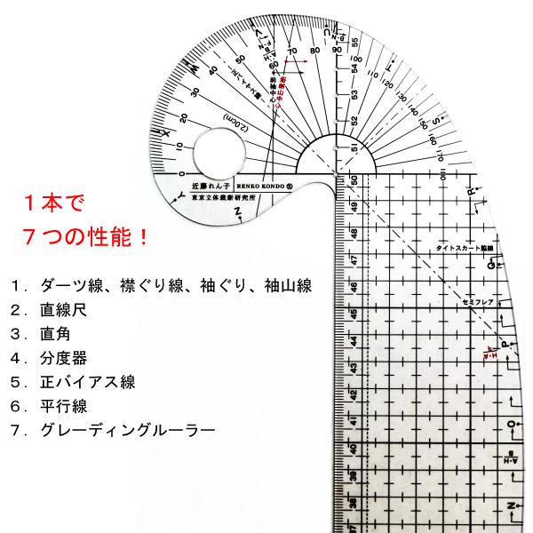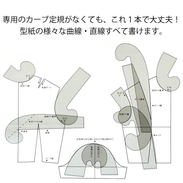 東京立体裁断 カーブルーラー品番:10969入数:1用途:製図用JAN:45485031096921本で7つの性能!性能1.ダーツ線、襟ぐり線、袖ぐり、袖山線2.直線尺3.直角4.分度器5.正バイアス線6.平行線7.グレーディングルーラー