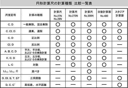 No.270N と同様に、足し算、引き算以外の一般的な計算(掛け算、割り算、二乗や三乗などの計算)だけではなく、より広範囲の計算が可能な計算尺です。一般計算のほかには、対数・高べき・三角関数・立方・平方などの計算ができる優れた計算尺です。