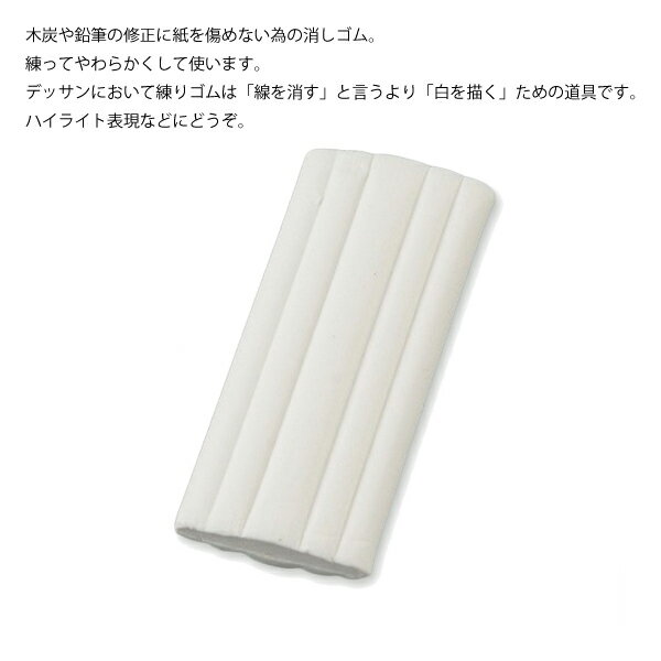 ホルベイン ネリゴムNo.3入り数:5個サイズ:29×70mm重さ:20g木炭や鉛筆の修正に紙を傷めない為の消しゴム。練ってやわらかくして使います。デッサンにおいて練りゴムは「線を消す」と言うより「白を描く」ための道具です。ハイライト表現などにどうぞ。