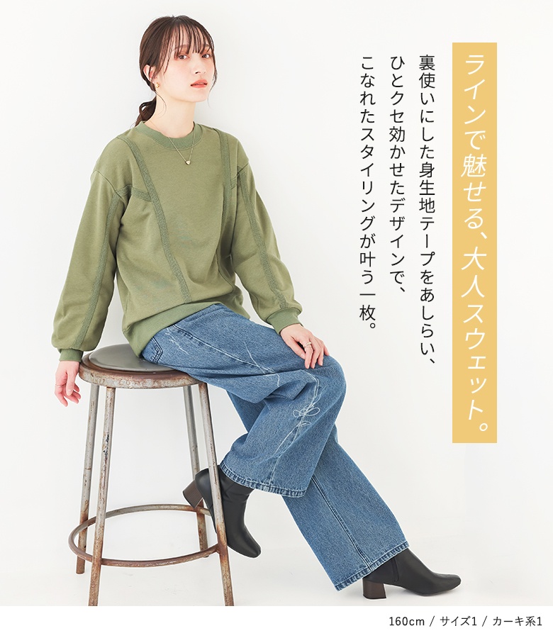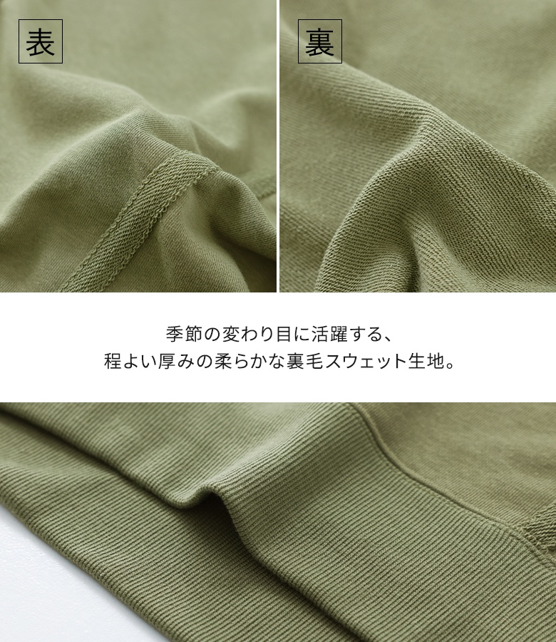裏使いにした身生地テープをあしらったシンプルスウェット。