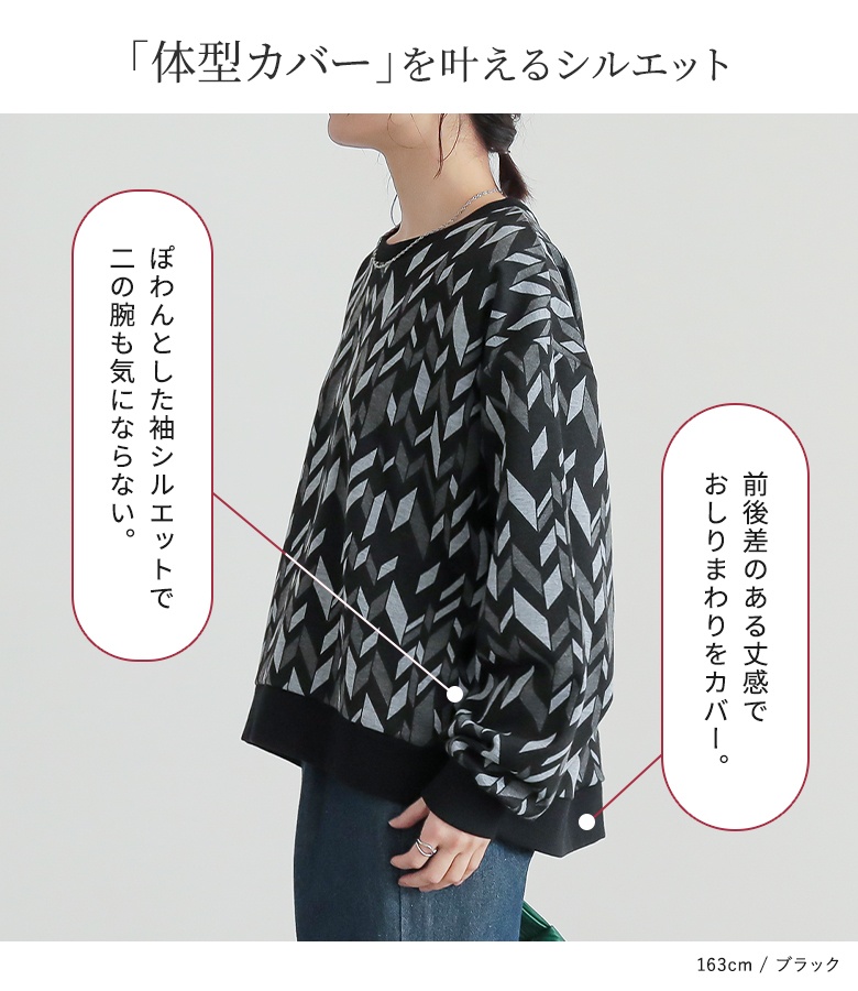 トップス レディース カットソー 長袖 ジャカード 幾何学柄 ロングシーズン ぽわん袖 前後差 体型カバー オシャレウォーカー 【TP】 ロンT トレーナー スウェット プルオーバー クルーネック n'OrLABEL ノア―ルレーベル 大人女子 大人可愛い お洒落可愛い 大人カジュアル ベーシック ニュアンス ラフ エフォートレス オフィスカジュアル ミディ丈 ミドル丈 総柄 ジャガード おうちで洗える 秋 冬 カジュアル シンプル キレカジ ガーリー Sサイズ Mサイズ Lサイズ LLサイズ 3Lサイズ XLサイズ フリーサイズ ぽっちゃり 大きいサイズ プラスサイズ 10代 20代 30代 40代 50代 60代 低身長 高身長 女子会 オフィス 通勤 通学 お買い物 お出掛け 旅行 リゾート レジャー アウトドア キャンプ パーティー 学校行事 ママ 母 母親 osharewalker グリーン 緑 カーキ ブラウン 茶色 ブラック 黒 オフィス・ビジネス[ID]14tm0ow[n'OrLABEL幾何学柄ジャカードカットソー]