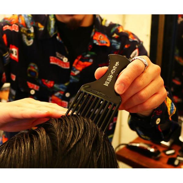 こちらのコームは一般的には "アフロコーム" と呼ばれており、バーバースタイルにおいてはポンパドールなどのヘアスタイルで、前髪の高さを出すスタイリングの際に使用頂く事で、簡単に、そして質の高いスタイリングを実現することが可能となっております。