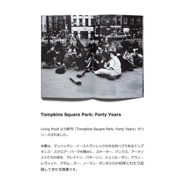 本書は、マンハッタン・イーストヴィレッジの文化的ハブであるトンプキンス・スクエア・パークを舞台に、スケーター、パンクス、アーティストたちの姿を、クレイトン・パターソン、シェリル・ダン、アラン・レヴィット、アダム・ズー、ノーラン・ザンガスらが40年にわたり記録してきた写真集です。