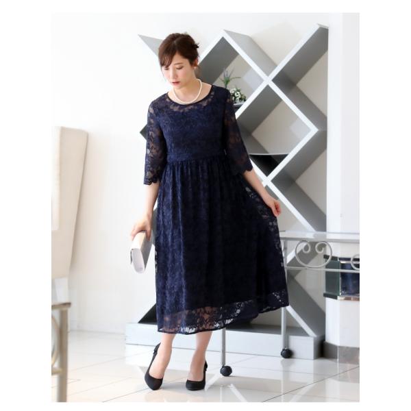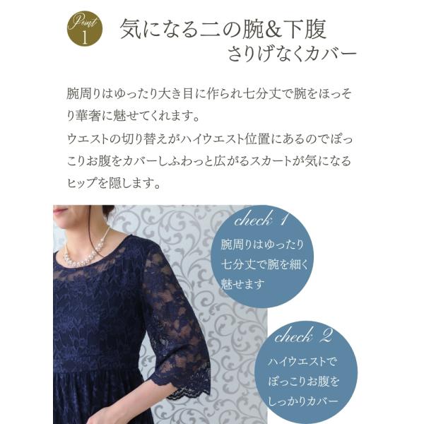 【商品特徴】レース ロング 総レース 袖レース 袖あり 長袖 7分 きれいめ エレガント 大人 上品 体形カバー 二の腕カバー aライン フレア