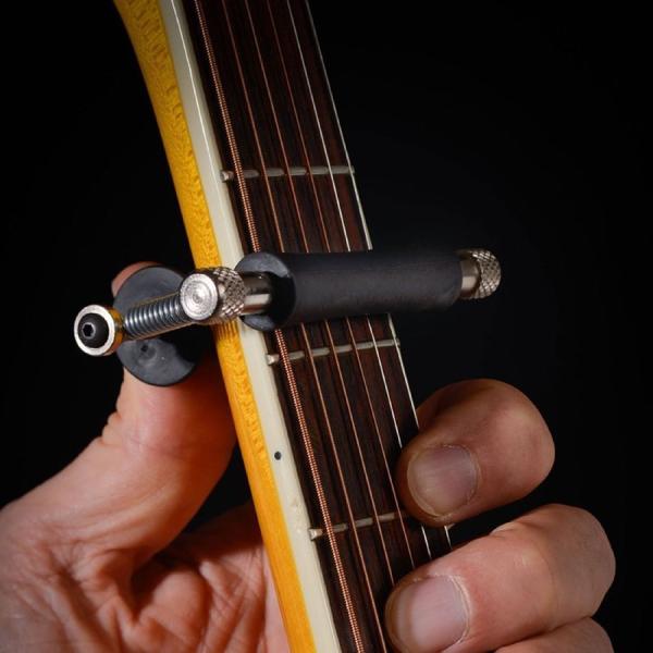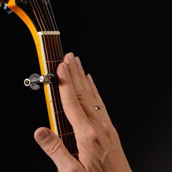 ・弦を押さえているローラーを回して、また、裏側のローラーを親指で回すことで、演奏しながら簡単にキーチェンジが可能なローリングカポタスト。