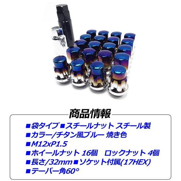 ホイールナット スチールナット ロックナット 付き 盗難防止 チタンブルー 20個 M12 P1.5 袋ナット ラグナット トヨタ マツダ ダイハツ
