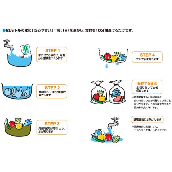 安心やさいを水に溶かした時に生ずる強アルカリ性の洗浄力により一般生菌・カビ菌・食中毒の原因菌などが取り除かれます。更に、抗菌力効果で、食材の日持ちが向上します。