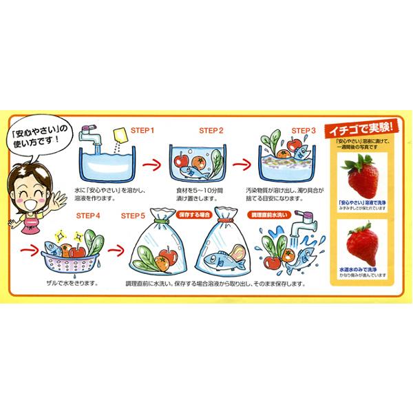 食材に付着している農薬、ワックス、防腐剤、着色料などの添加物や、環境ホルモンは私達の免疫力の低下、アレルギーなどを引き起こす原因の一つになっています。(私達は有害物質を年間平均3〜4kg摂取していると言われています。)安心やさいはこのような人体に不必要な有害物質を取り除きます。
