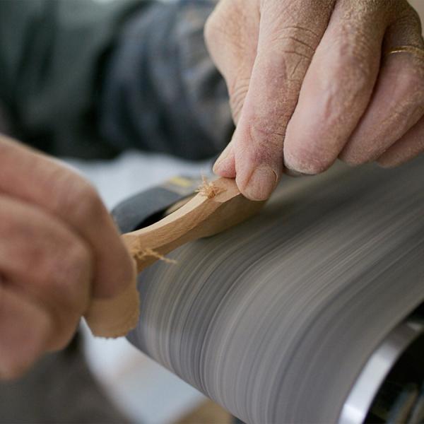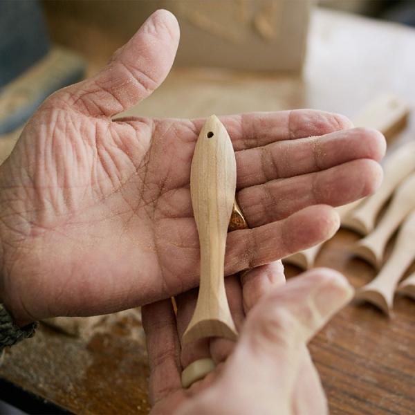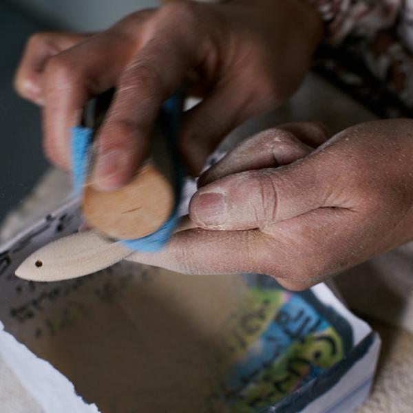 木材からお魚の形のキーホルダーになるまでの全行程を、地元の方々がすべて手作業で作っています。